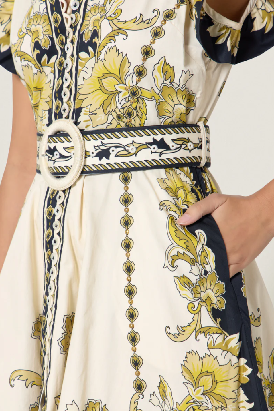 • Designed with a classic collar and centre-front placket, it is finished with contrast-stitched mother-of-pearl buttons and a detachable belt featuring a round fabric-covered buckle for sculpted elegance.
