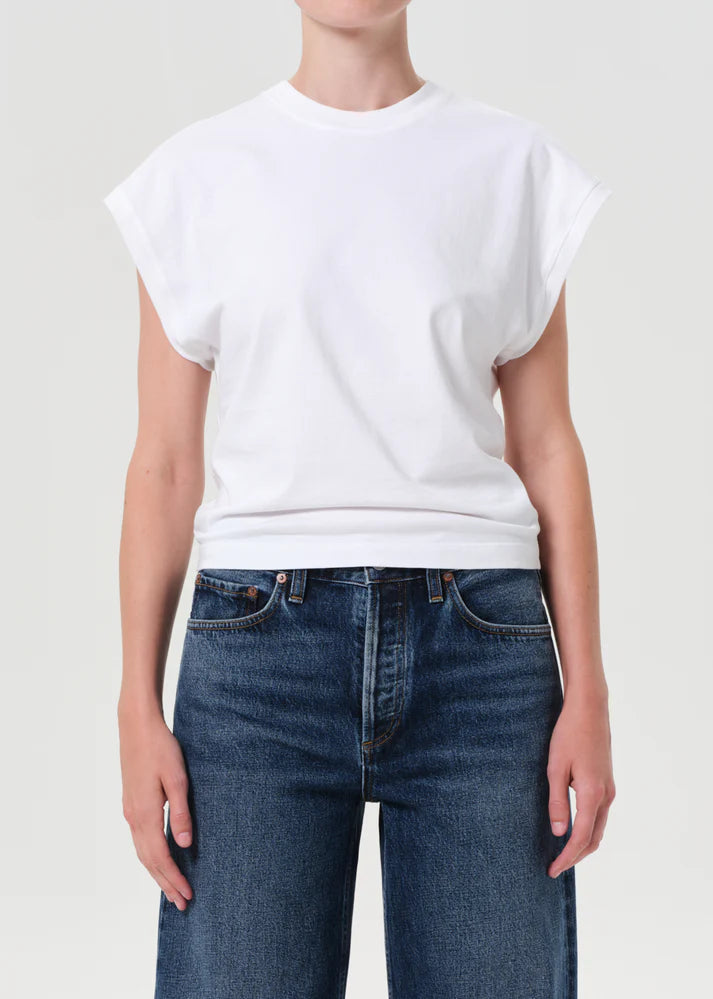 Clean white tee with exaggerated cap sleeves, crafted from lightweight, breathable jersey cotton. The relaxed silhouette skims the body for a modern, effortless fit.