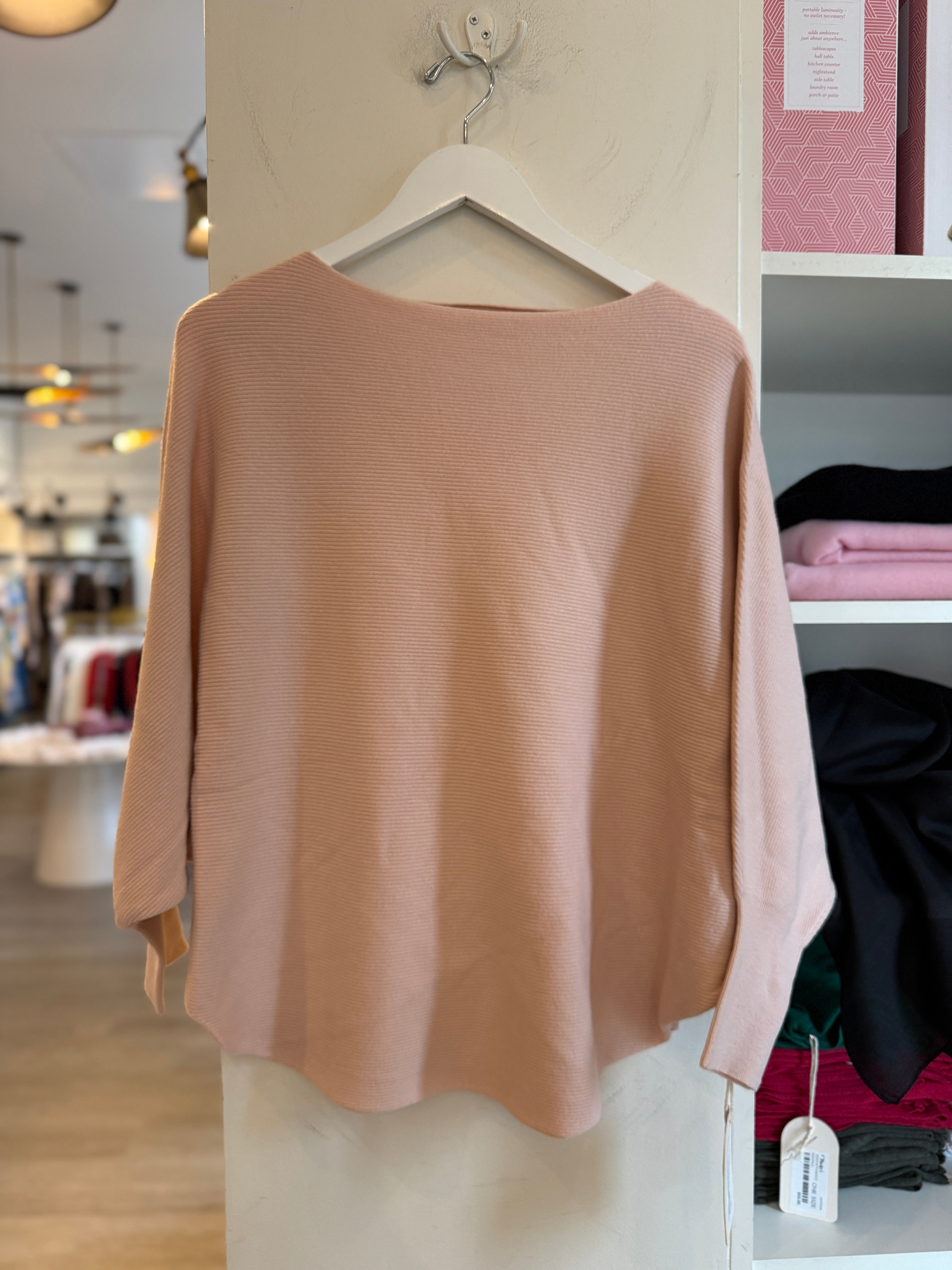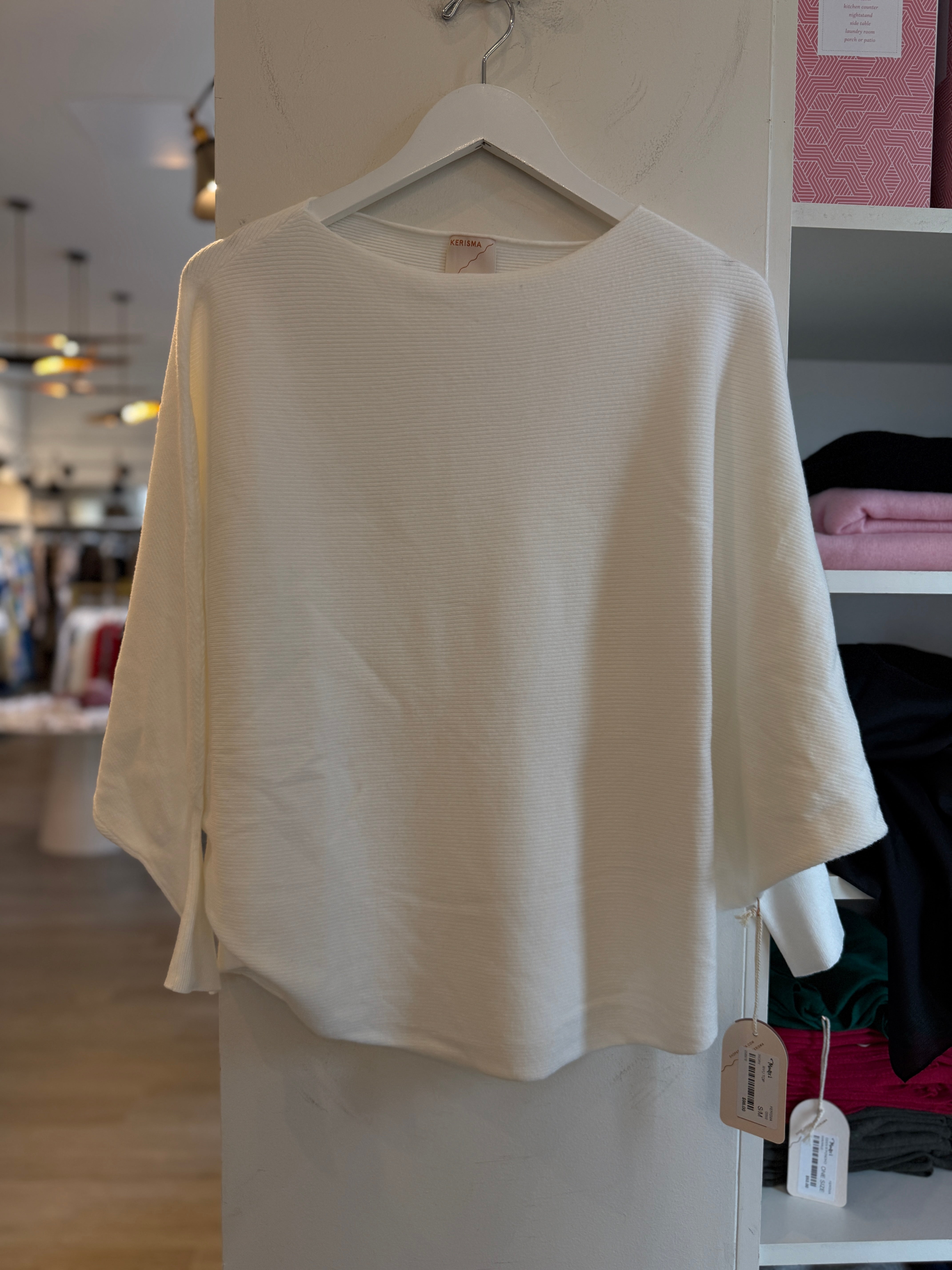 - TURTLENECK 3/4 SLEEVE TUNIC IN GARTER STITCH WITH SIDE SLITS AND CONTRASTING RIB ACCENTS.