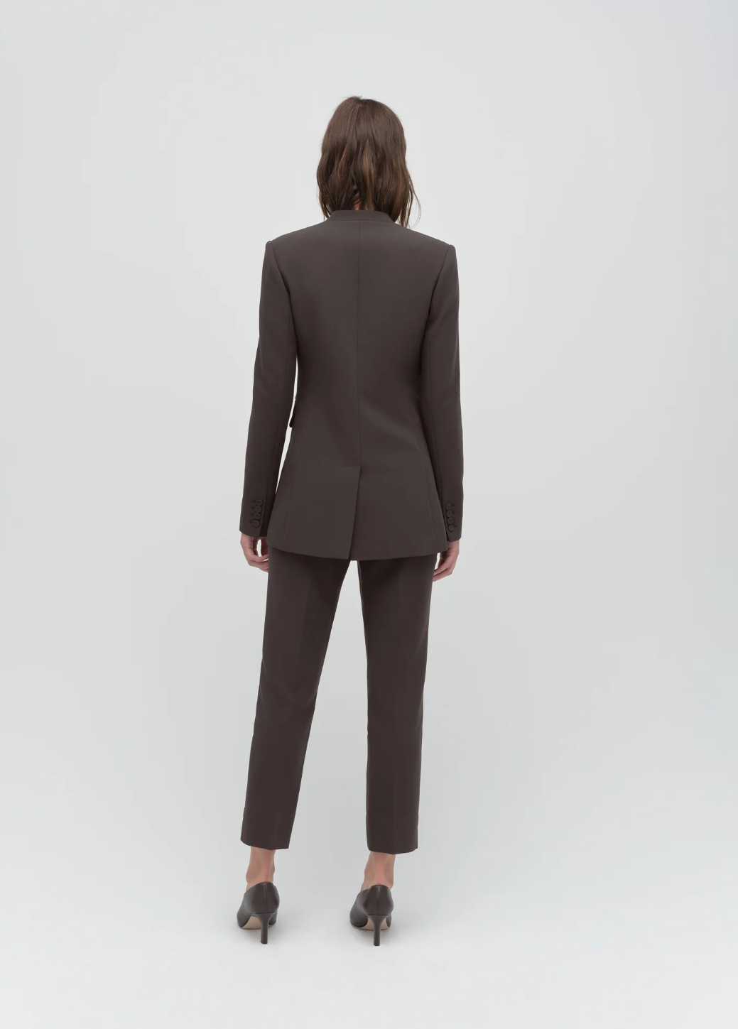 • It’s cut for a slim fit with collarless styling and double-breasted details.