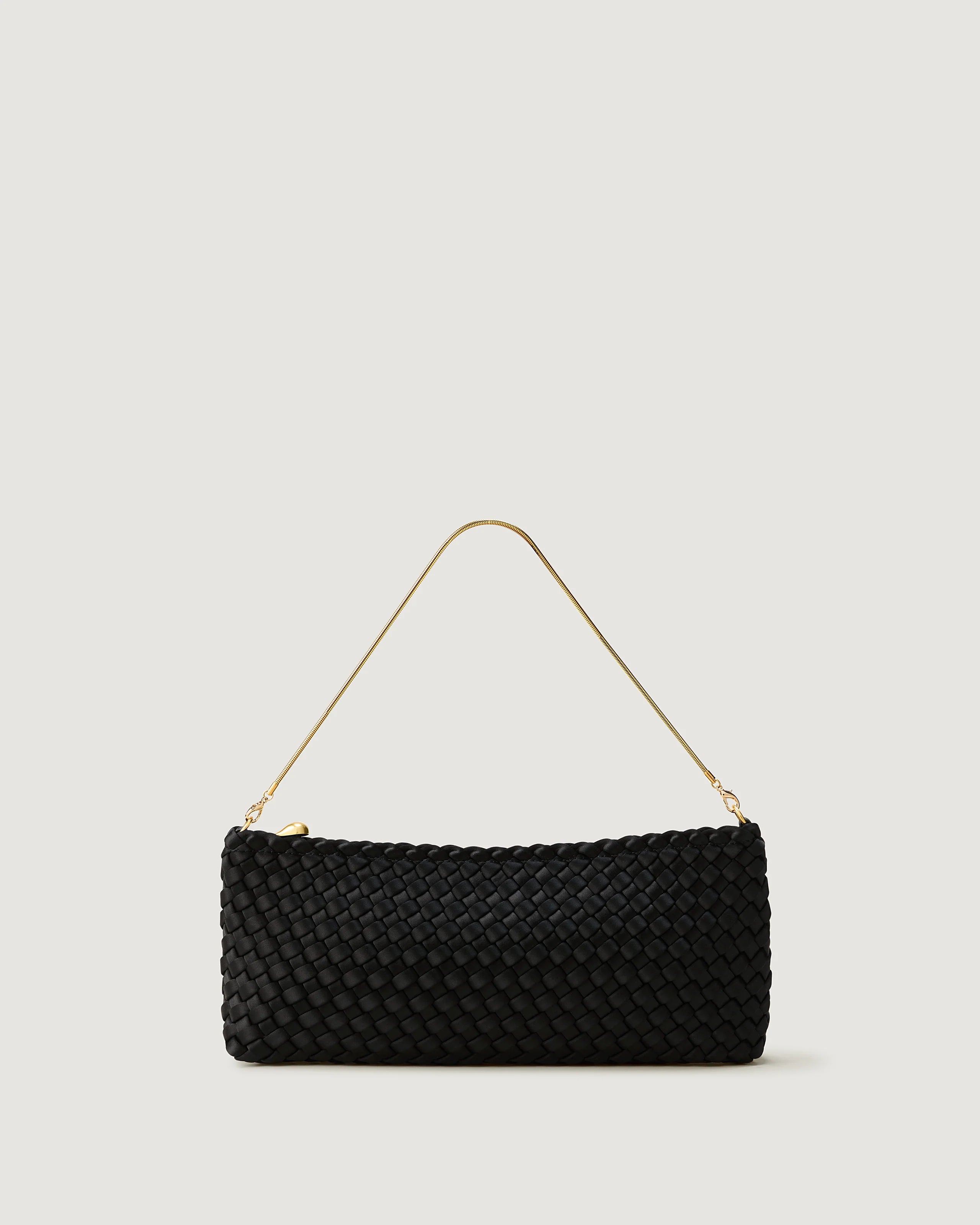 The Gala Clutch in handwoven true black satin offers a refined update to the classic evening bag. This elevated clutch features a sleek baguette silhouette that feels both timeless and modern—the perfect evening accessory.