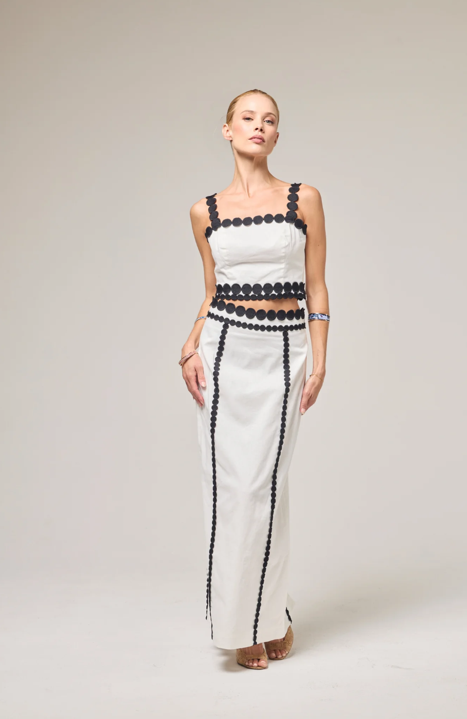 - Cut in crisp ivory and framed with contrast black running dot trim, it skims straight through the hips and falls to an ankle-grazing hem with a back slit for movement.