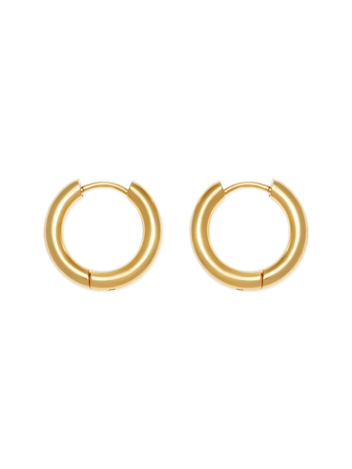 • These huggie hoops are an easy every-day staple you'll reach for again and again. Wear them solo or feed on our huggie charms to customize your look. 18K gold plating over brass.