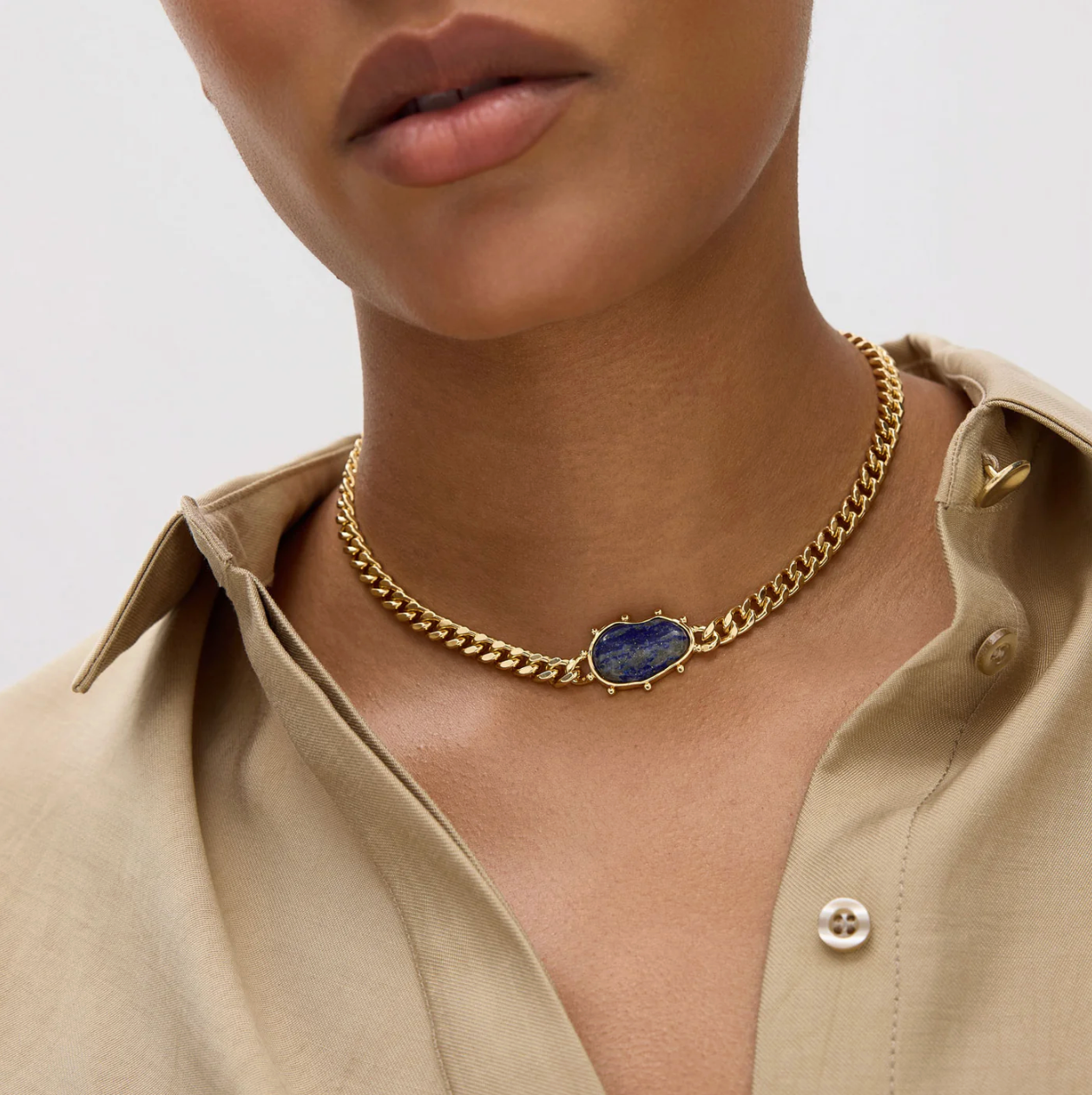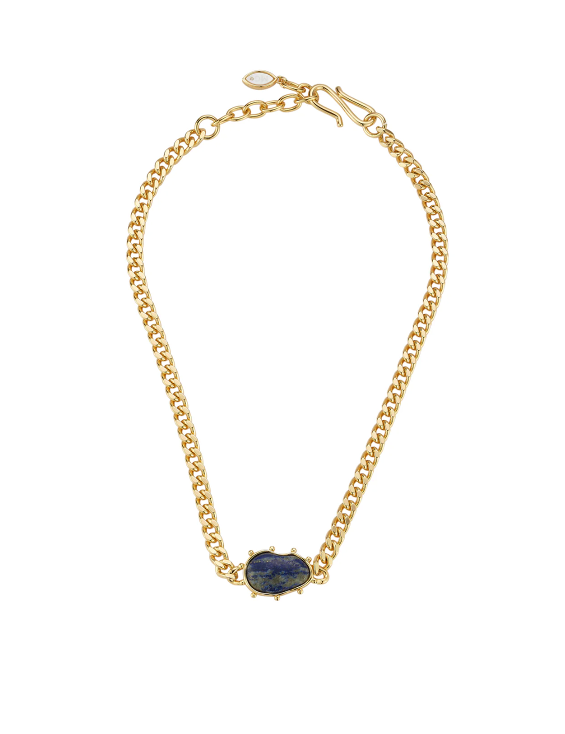 • A sleek gold curb chain anchored by a deep lapis centerpiece, this minimalist design blends timeless elegance with a touch of earthy allure.