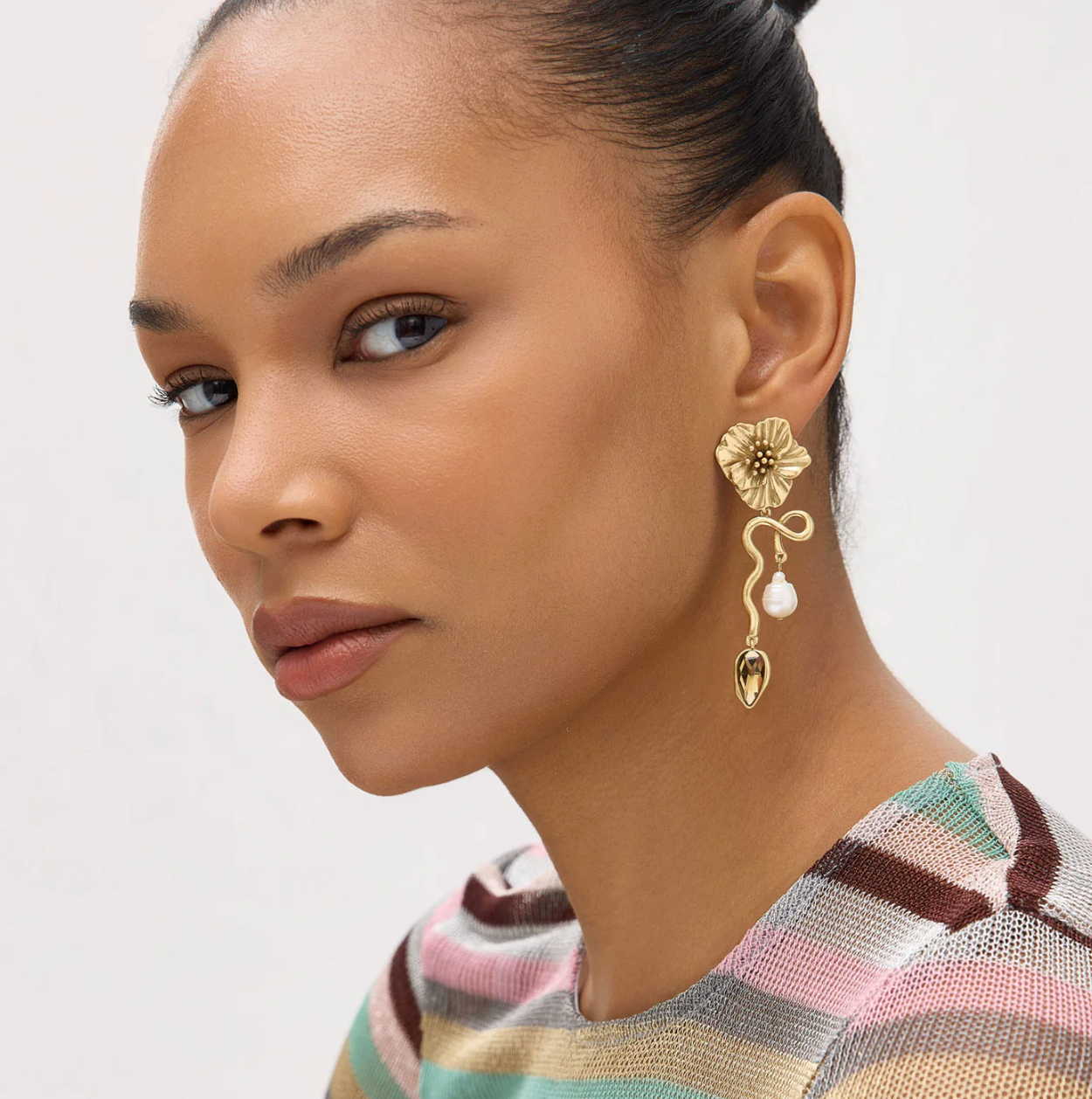 • Antiqued gold flowers give way to wavy stems adorned with freshwater pearls and faceted crystals, a delicate mix of vintage charm and modern design.