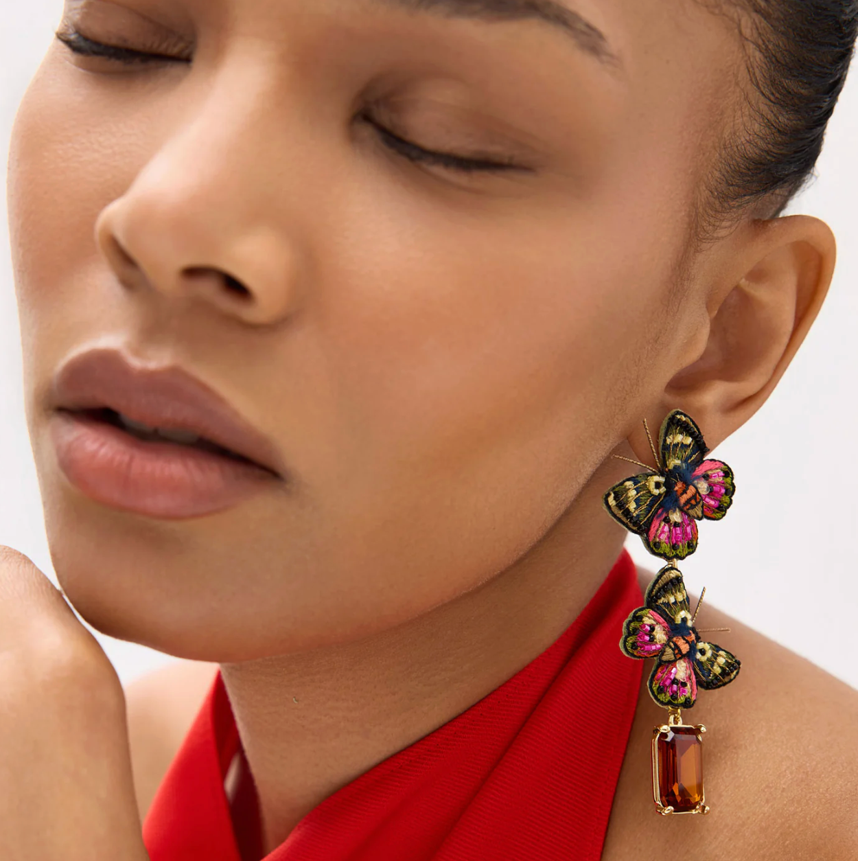 • The Luxe Colette Earrings feature intricately embroidered butterflies adorned with sparkling crystals, creating a bold statement accessory.