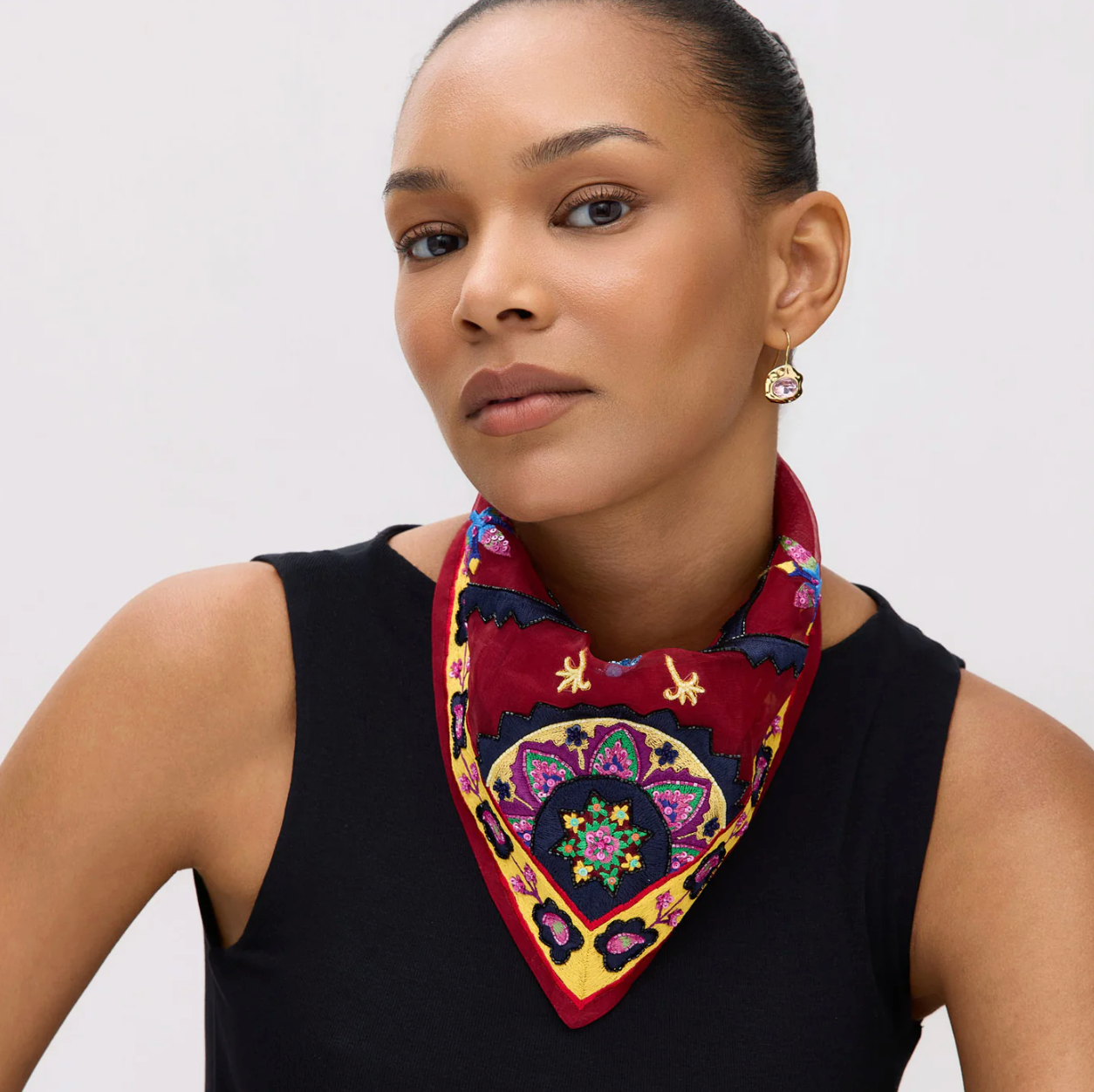 • Rich red silk chiffon adorned with intricate embroidery in vibrant jewel tones, a statement bandana that blends artisanal craft with standout color.