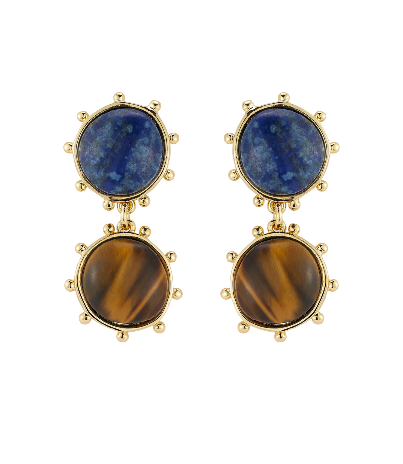 • Rich blue lapis meets golden-brown tiger's eye in these double drop earrings, framed in gold for a striking balance of bold color and natural elegance.
