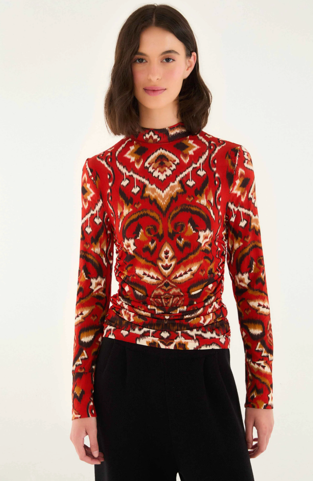 - The Cream Ainika Pineapple Ikat Blouse dazzles with its rich, warm palette of reds, browns, and creams, inspired by traditional ikat patterns.