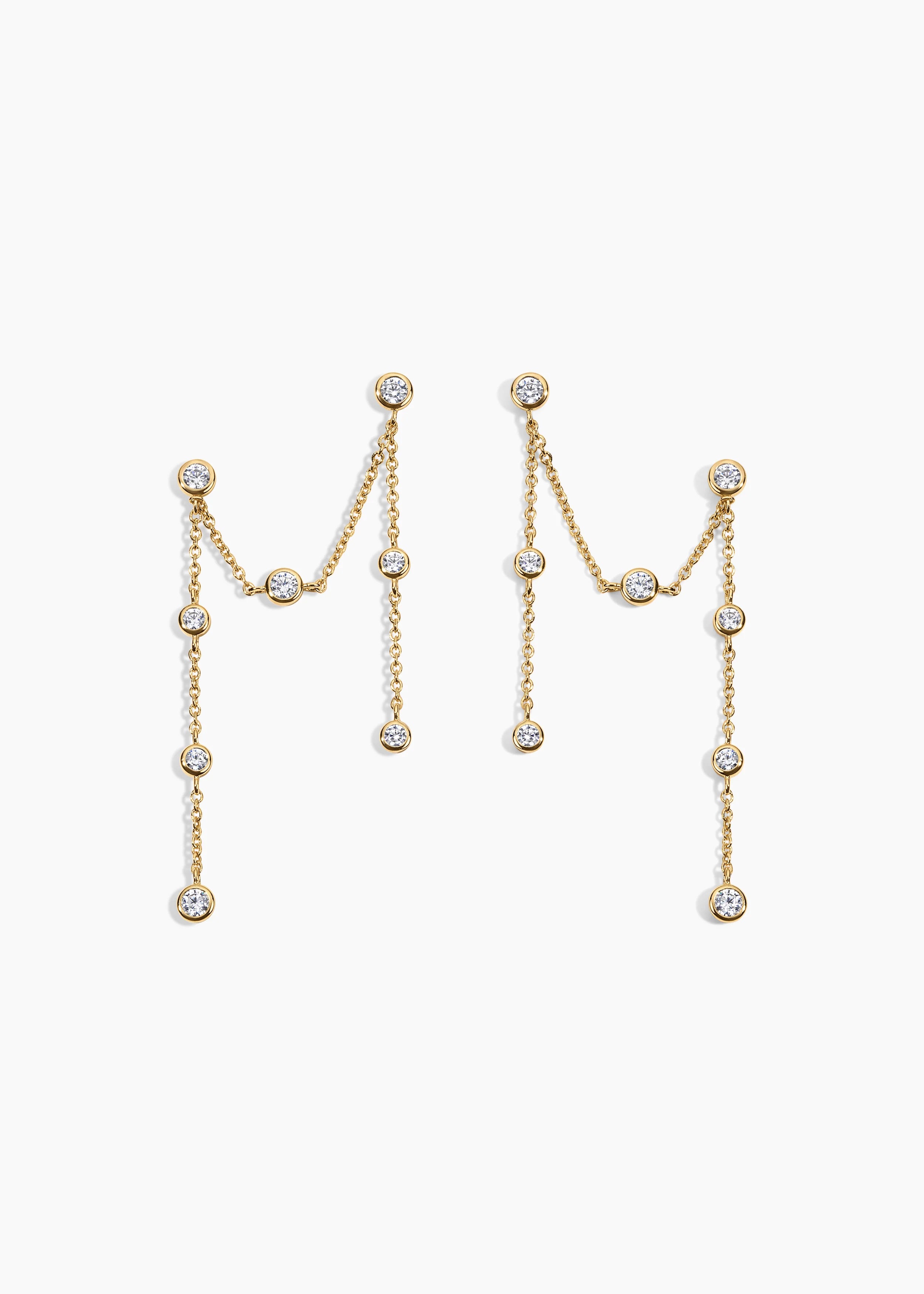 Make your earring stack shine with this stunning climber pair. The Dewy Earrings have a statement-making drop on each end, connected by a draped link chain, spaced with oval bezel-set crystals.