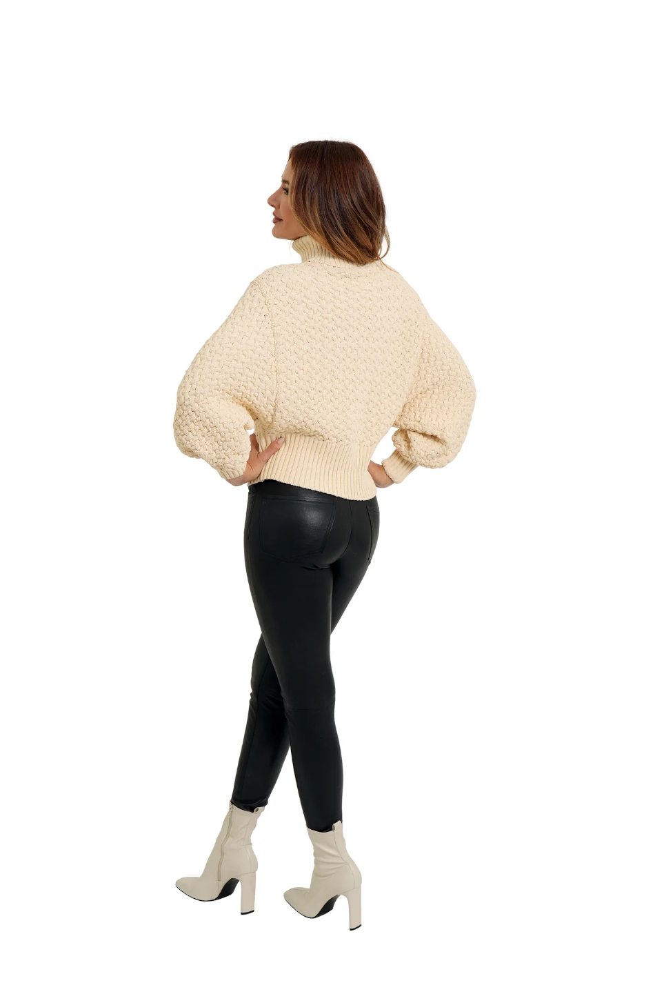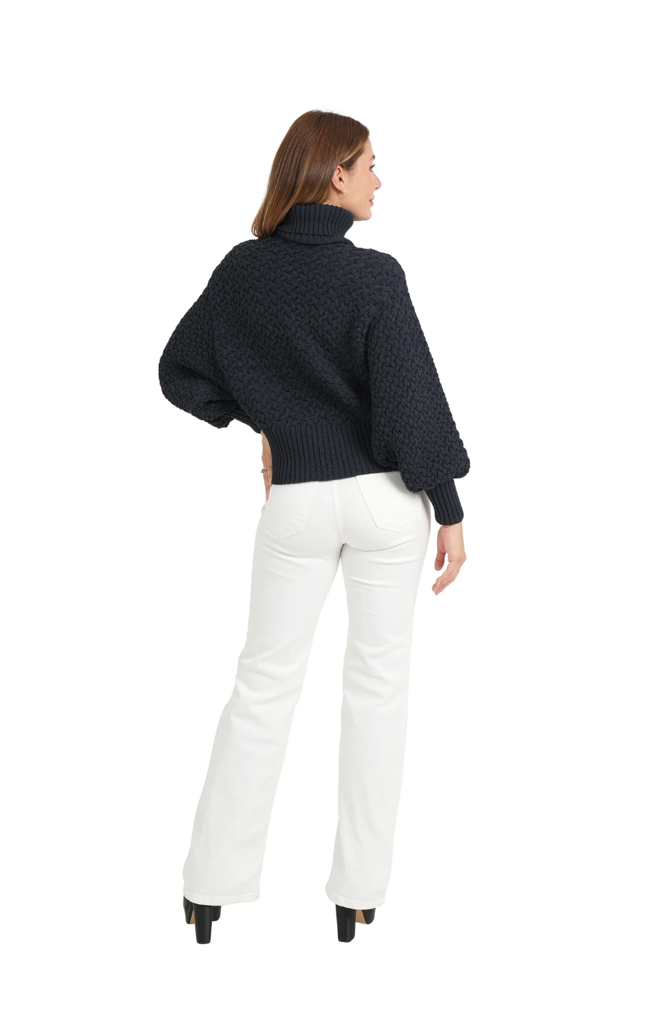 - Holly basket weave sweater, turtle neck, balloon sleeves, ribbed neck, hem, and & sleeve cuffs.