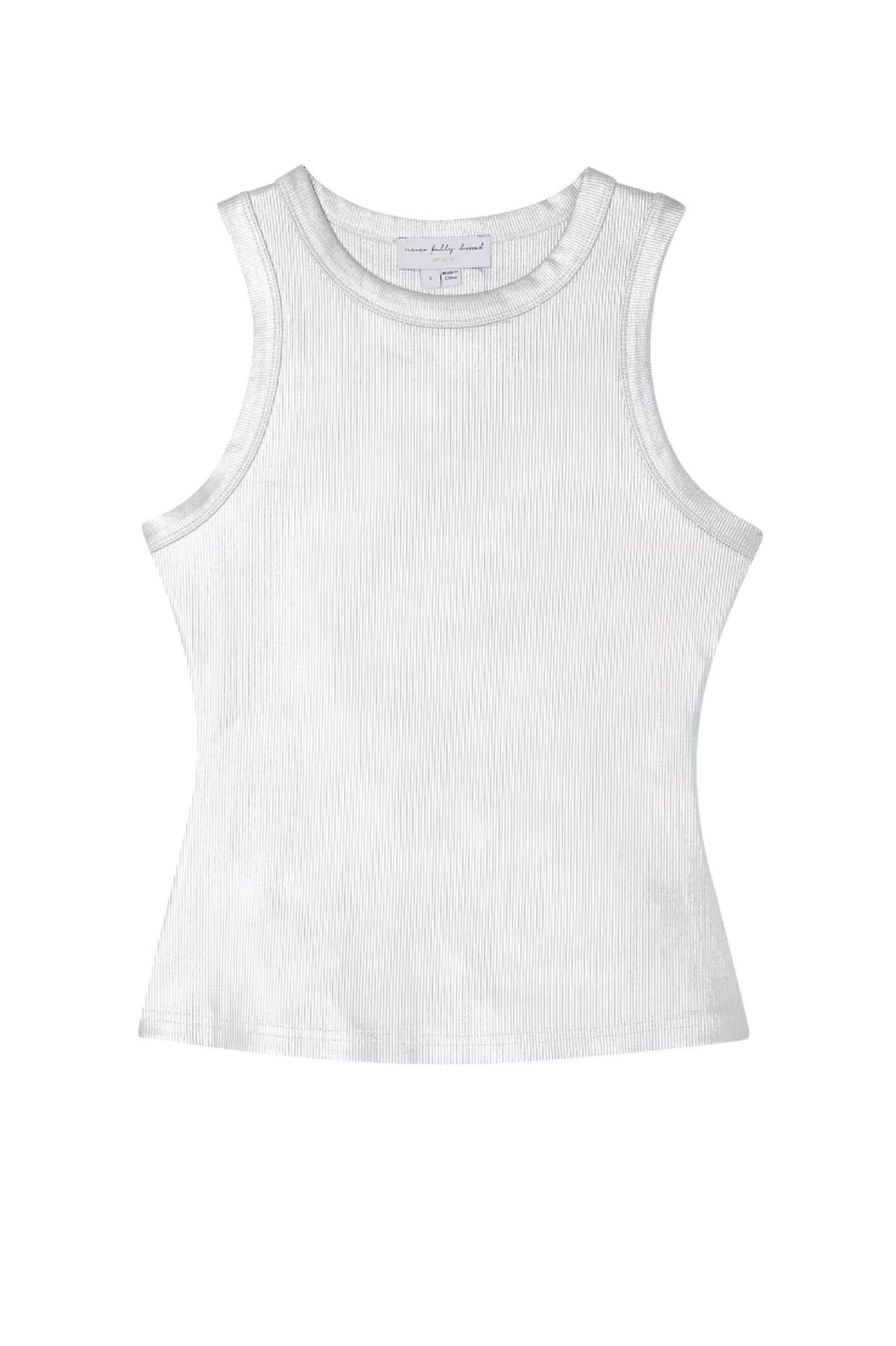 - A soft stretch ribbed tank, the perfect foundation for versatile styling. In block colors, these tanks can be paired with anything, or layered under a light jacket for spring. The metallic silver is such a special addition to a simple shape. Embroidered with the NFD logo for a special finishing touch.