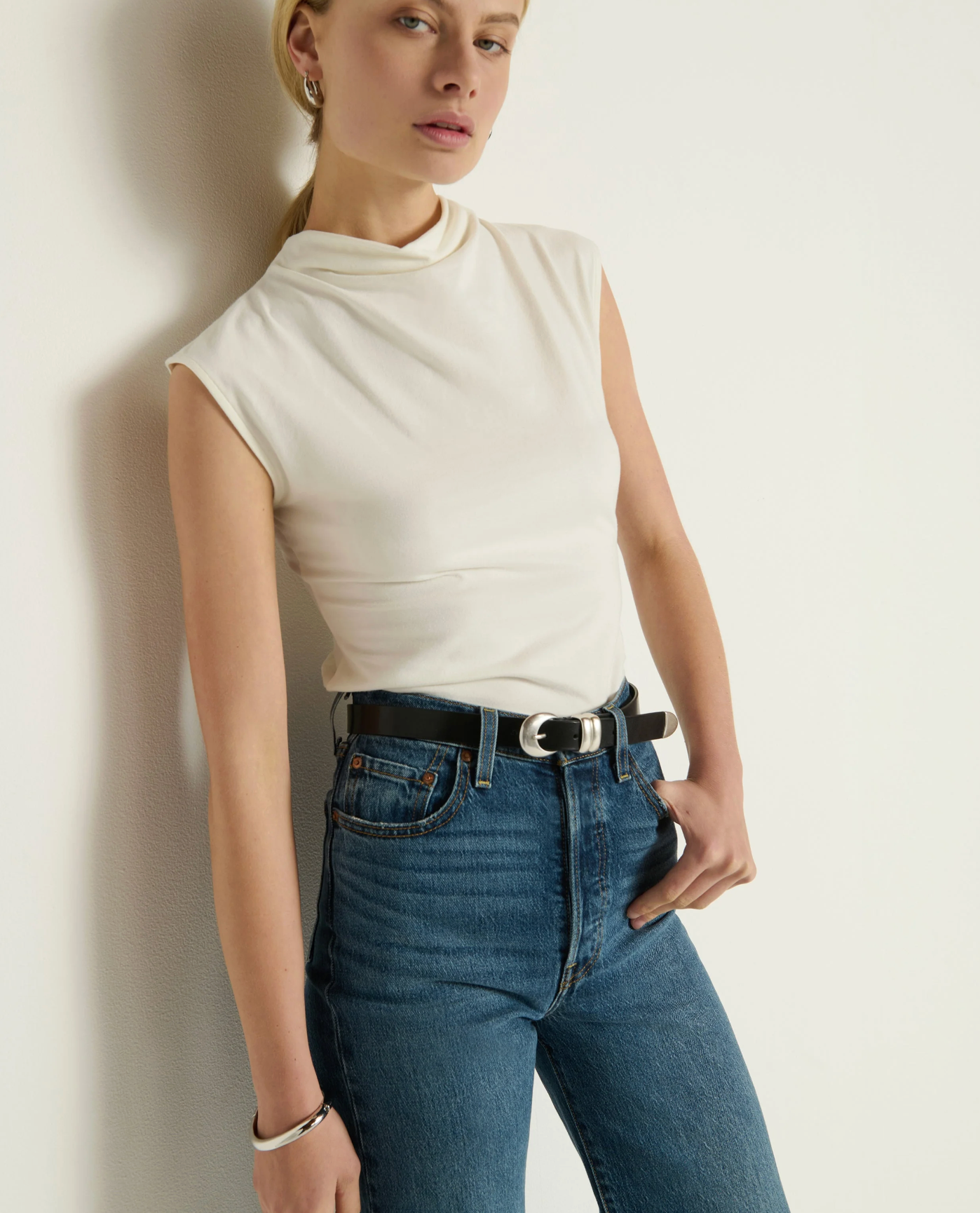 • Minimal, structured, and elegantly feminine, this sleeveless mock neck tank has a clean silhouette, a subtle draping, and a button closure.
