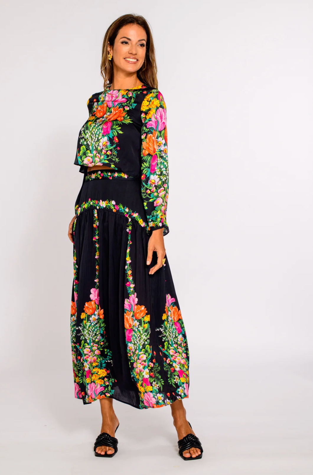 • This season, Phoebe is cut from the Centerpiece print, with pops of color on a black satin fabric.