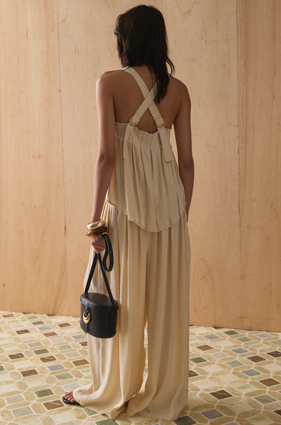 • Gorgeously pleated in a little cropped shape, the back features a D-ring attachment for the straps so they can be adjusted or changed to a crossover style.