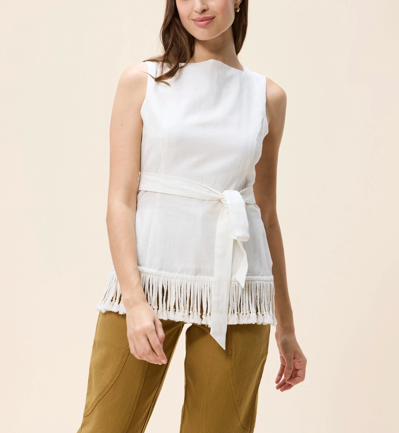 • This sleeveless silhouette features flattering princess seams that create a clean, structured fit, while the tassel fringe hem adds a touch of playful movement and artisanal charm.