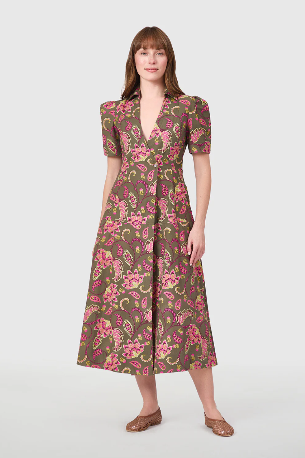 - The Clark Dress features a flattering faux-wrap bodice with a notched collar and short, tailored sleeves.