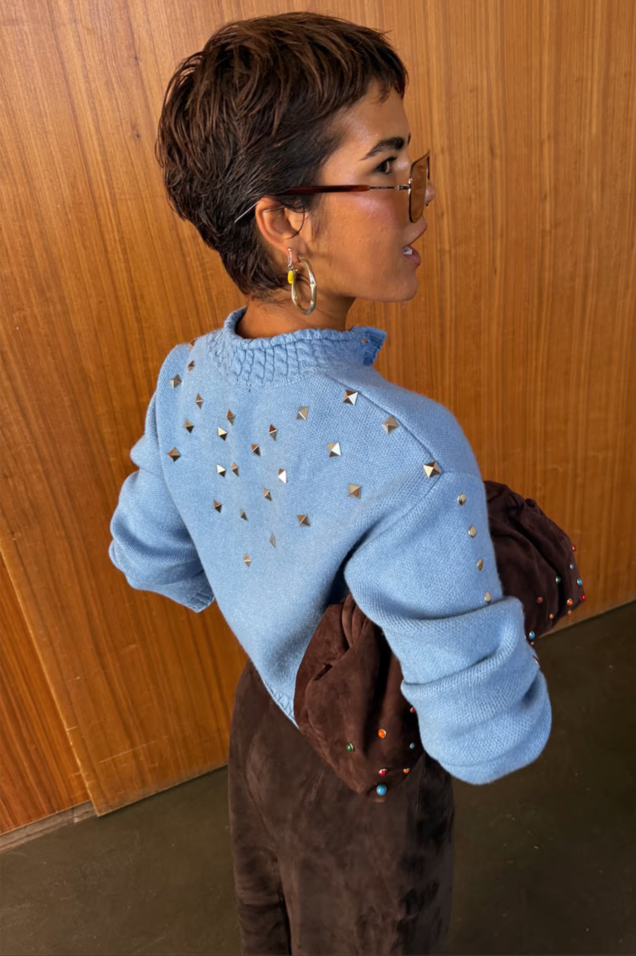 - Our stud range is our new way of elevating basic silhouette's with a pop of texture and sparkle! With silver metal studs along the sleeves and on the back, adding that extra NFD touch, as well as twist stitch detailing on the hems. We've also added small darts on the front and back of the cardi to create a more structured look. Pair with the matching jeans for a easy monochrome outfit.