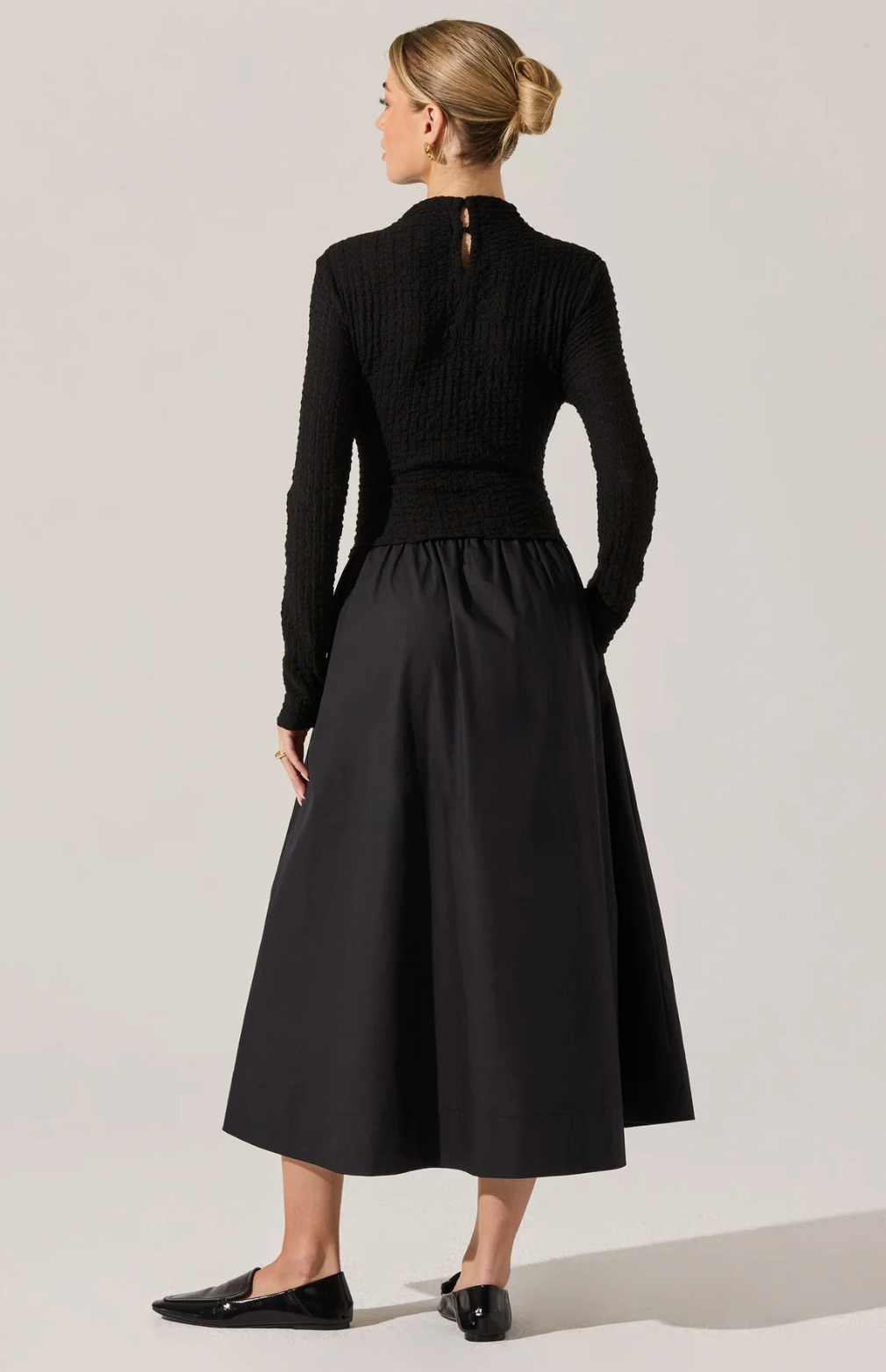 • Mock neck long sleeve sweater top with poplin A-line skirt