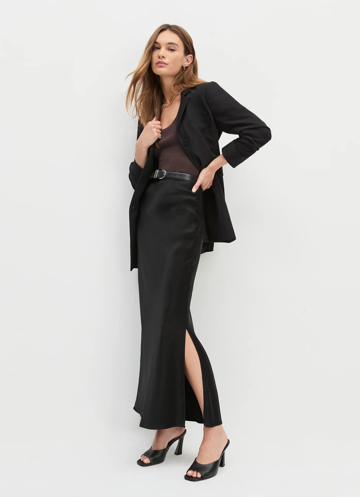 • A favorite for every season. The 36.5" bias-cut midi drapes just right with a billowy fit and an easy pull-on waist. Finished with an exposed band that sits high and a side slit that shows just enough.