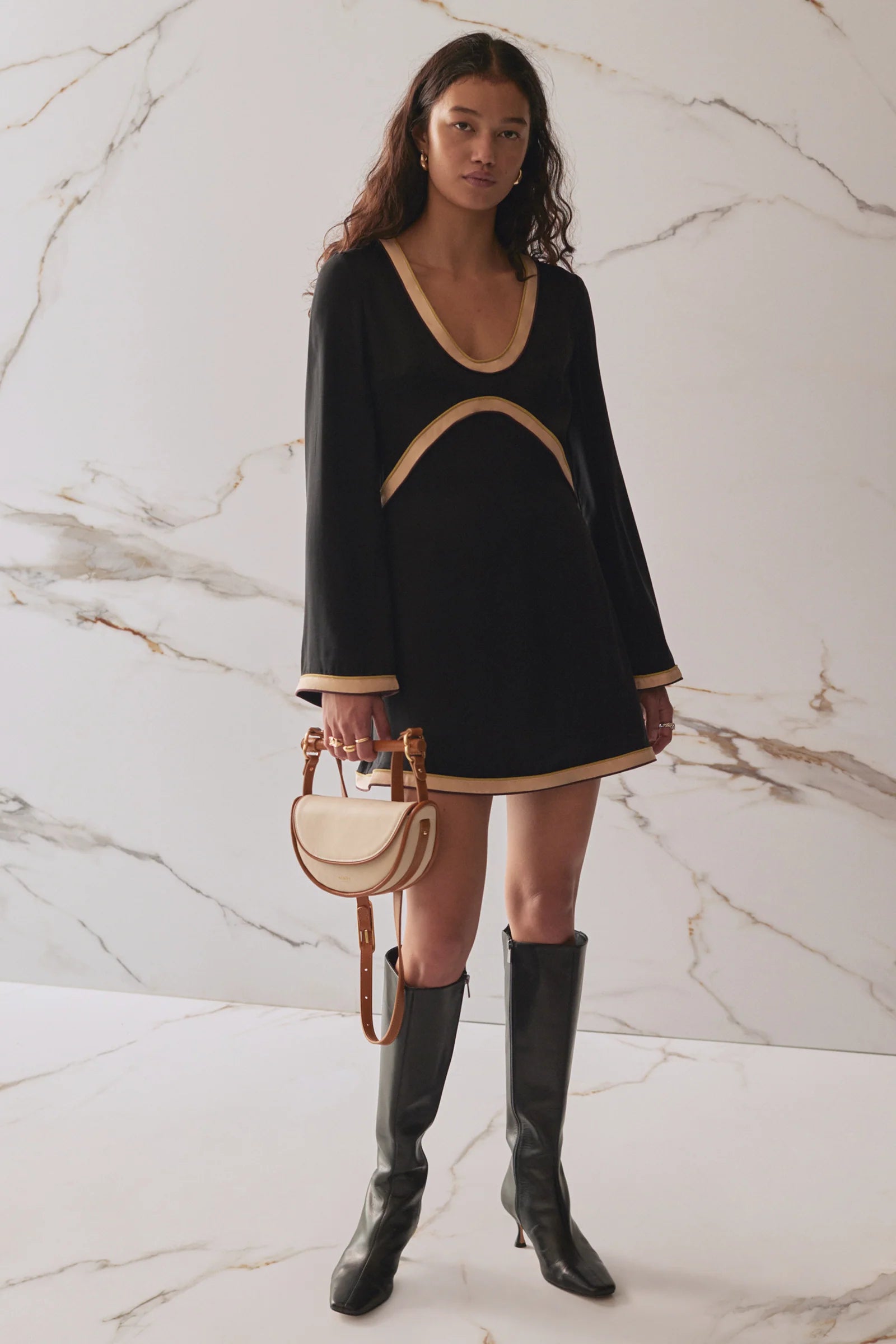 Our Luella Dress is a flattering mini like no other. Designed to contour the body with its curved binding lines, this dress gorgeously drapes into an a-line silhouette. Layer the Luella with our Alora Trench Coat and pair with some heels for a date night look.